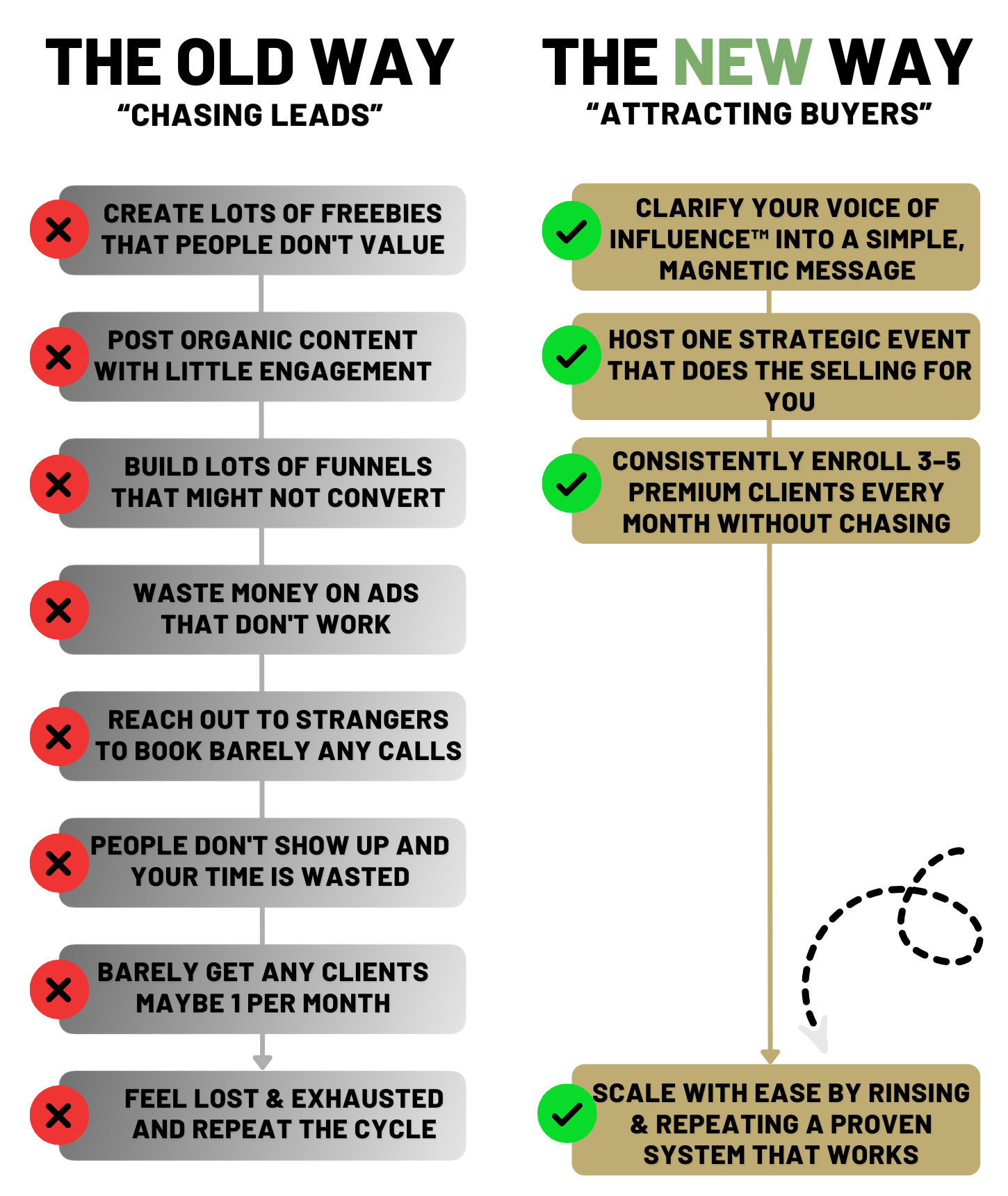 The way we do this is by getting clear on your Voice of Influence™, hosting a strategic event and converting premium clients on repeat.